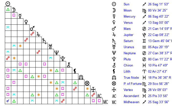 | Moon | 0 Virgo 27 | 12 Sagittarius 4 | 6 Libra 57 |