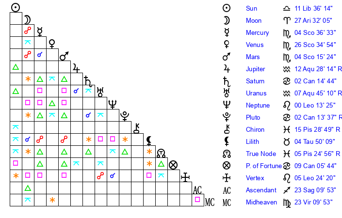 | Moon | 27 Aries 32 | 22 Pisces 50 | 19 Taurus 38 |