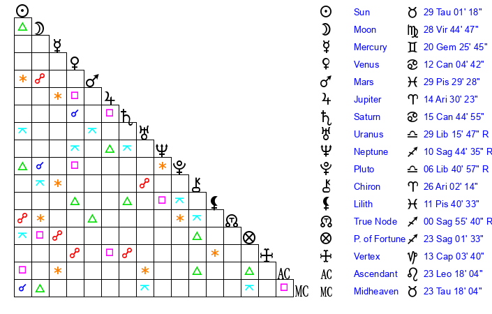 | Moon | 28 Virgo 50 | 1 Pisces 53 | 23 Cancer 28 |