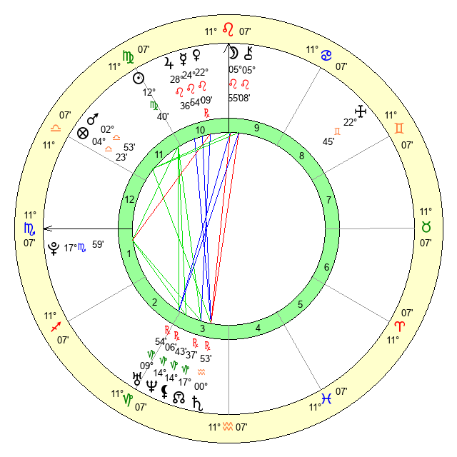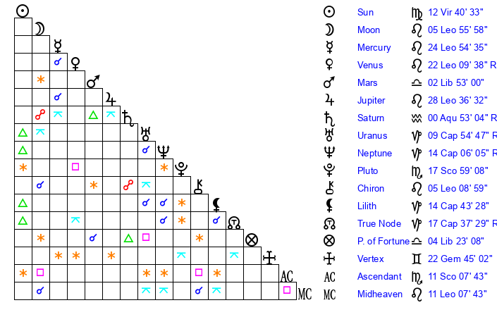 Moon | 5 Leo 54 | 17 Aquarius 27 | 8 Scorpio 46 |