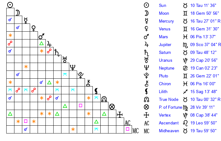 | Saturn | 10 Taurus 20 | 27 Pisces 50 | 20 Taurus 44 |