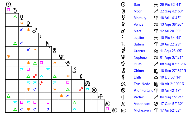 | Saturn | 20 Aries 11 | 23 Pisces 2 | 23 Aries 34 |