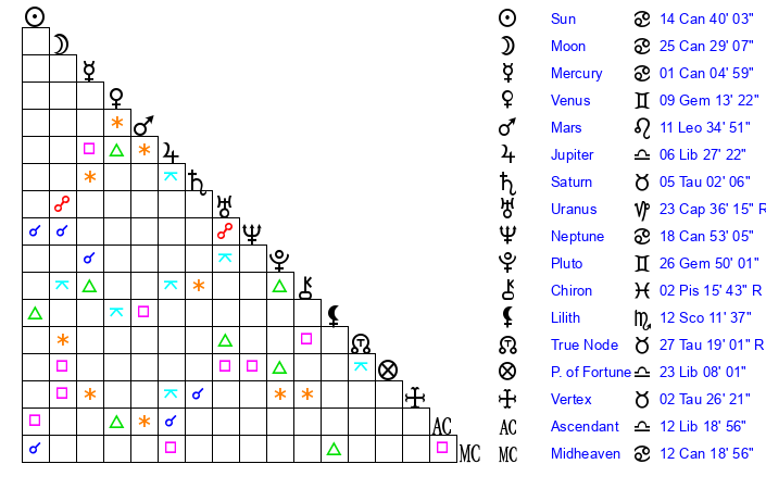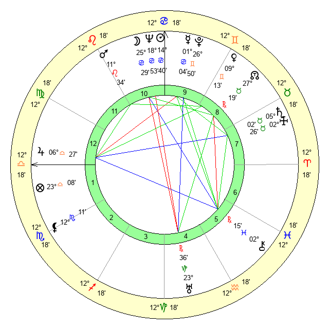 | Sun | 14 Cancer 40 | 15 Cancer 50 | 6 Scorpio 24 |