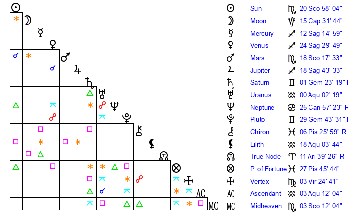 | Sun | 20 Scorpio 58 | 21 Scorpio 34 | 15 Pisces 32 |