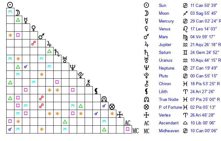 | Pluto | 0 Cancer 55 | 3 Aquarius 3 | 2 Cancer 9 |