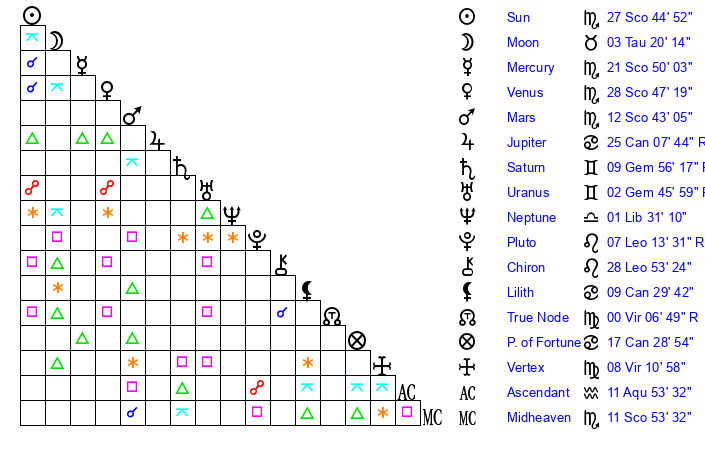 | Moon | 3 Taurus 15 | 3 Sagittarius 16 | 18 Taurus 30 |