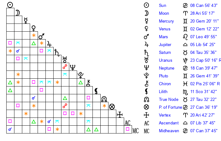 | Sun | 8 Cancer 57 | 10 Cancer 6 | 0 Scorpio 24 |