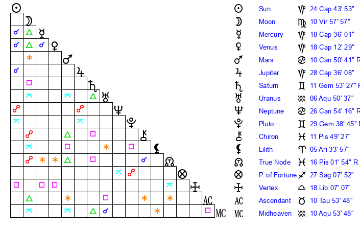 | Jupiter | 28 Capricorn 22 | 11 Gemini 55 | 20 Aquarius 4 |