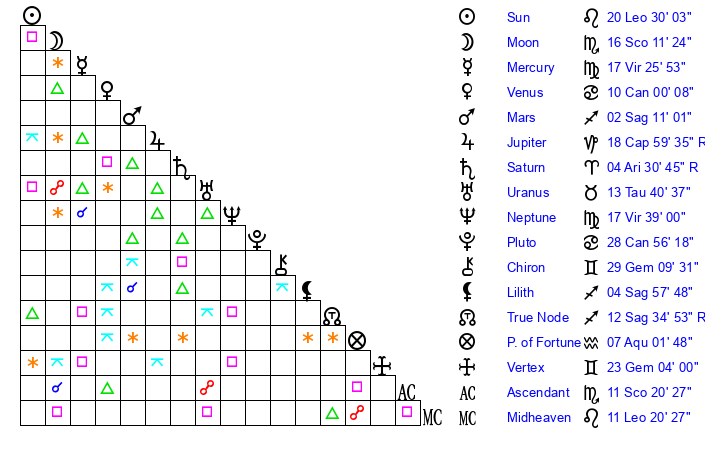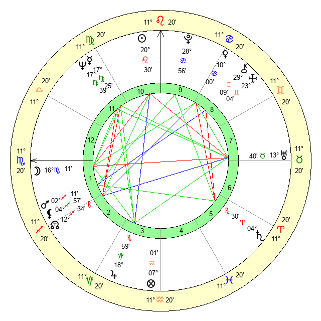 | Neptune | 17 Virgo 38 | 1 Aries 45 | 20 Virgo 36 |