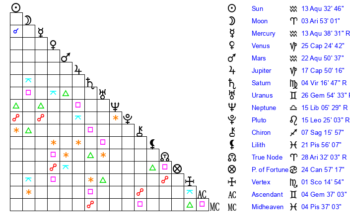 | Sun | 13 Aquarius 32 | 14 Aquarius 6 | 29 Aries 18 |