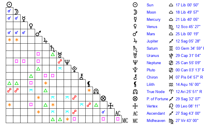 | Moon | 18 Libra 48 | 7 Gemini 2 | 9 Sagittarius 44 |