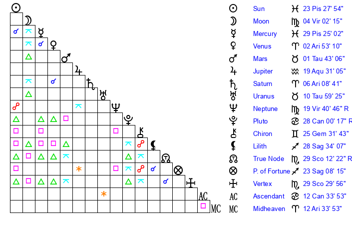 | Sun | 23 Pisces 27 | 24 Pisces 22 | 18 Gemini 11 |