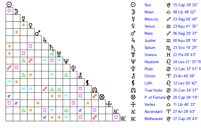| Saturn | 23 Scorpio 47 | 14 Pisces 55 | 25 Scorpio 18 |