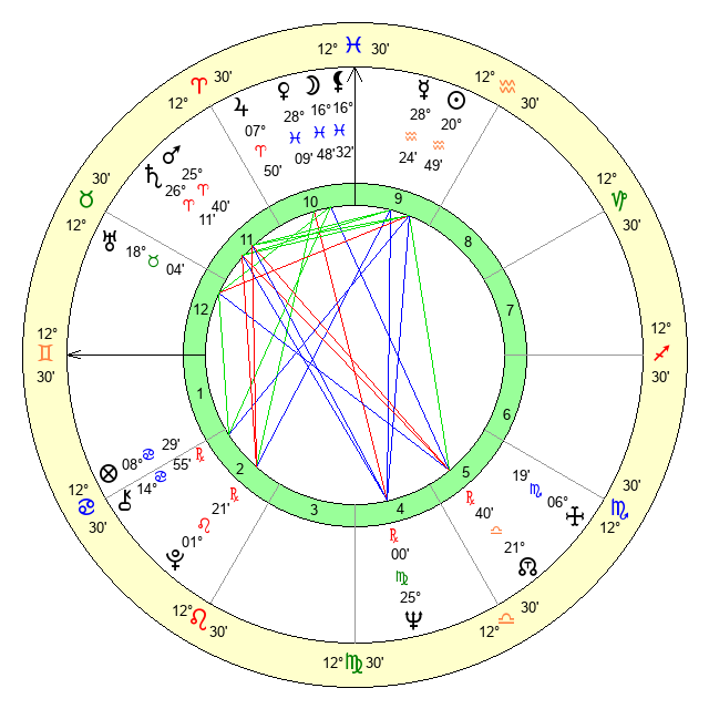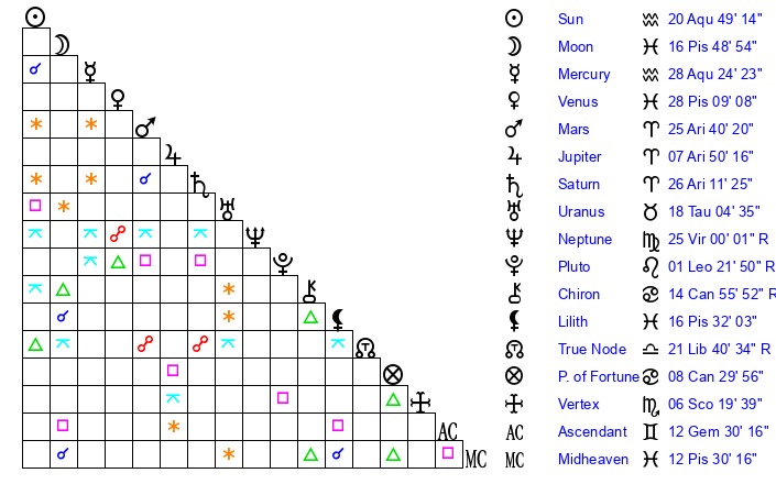 | Venus | 28 Pisces 9 | 4 Aries 19 | 29 Gemini 9 |