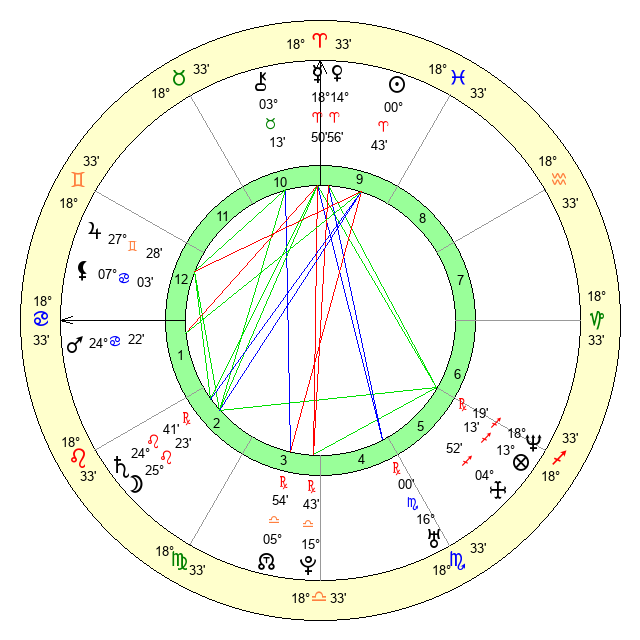 | Sun | 0 Aries 43 | 1 Aries 20 | 16 Taurus 46 |