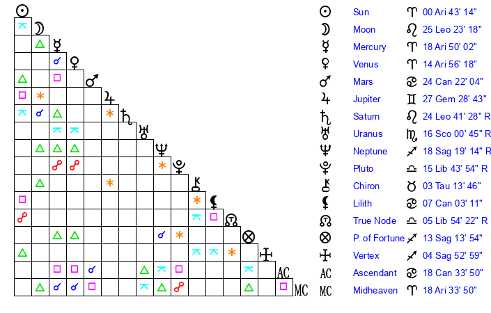 | Sun | 0 Aries 43 | 1 Aries 20 | 16 Taurus 46 |