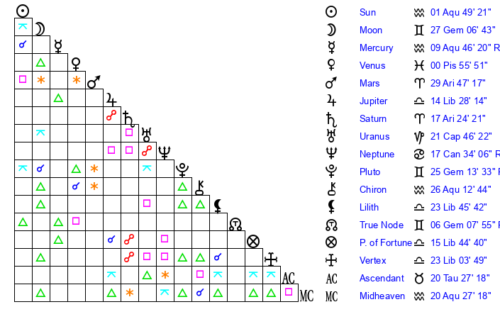 | Pluto | 25 Gemini 13 | 1 Aquarius 45 | 25 Gemini 39 |
