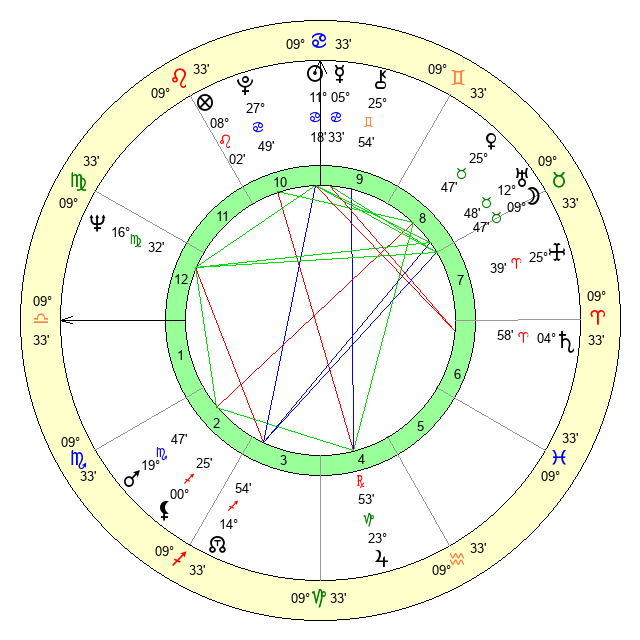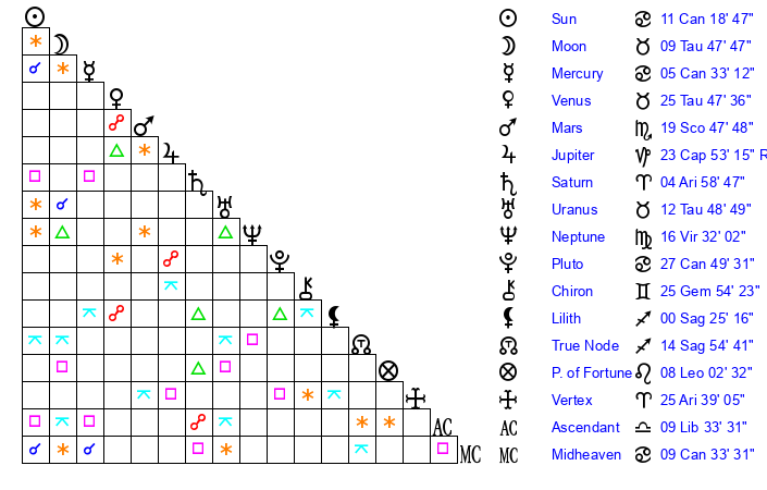 | Sun | 11 Cancer 19 | 12 Cancer 1 | 6 Libra 7 |