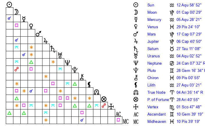 | Sun | 12 Aquarius 59 | 13 Aquarius 48 | 3 Gemini 34 |