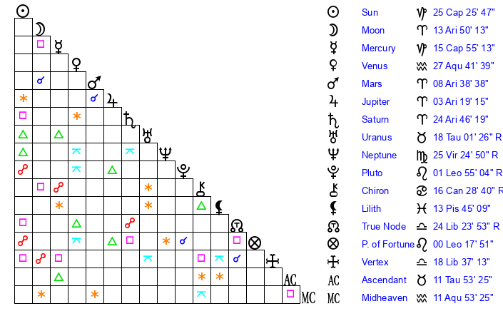 | Moon | 13 Aries 48 | 0 Virgo 4 | 22 Taurus 34 |