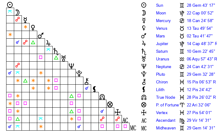 | Sun | 28 Gemini 43 | 29 Gemini 37 | 16 Libra 47 |