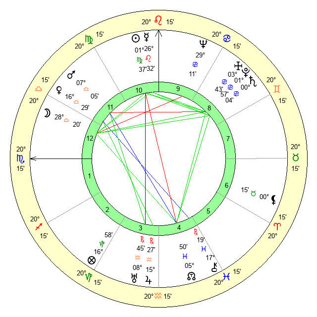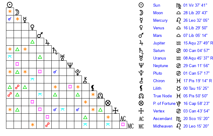 | Mercury | 26 Leo 32 | 16 Leo 6 | 9 Sagittarius 49 |
