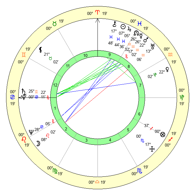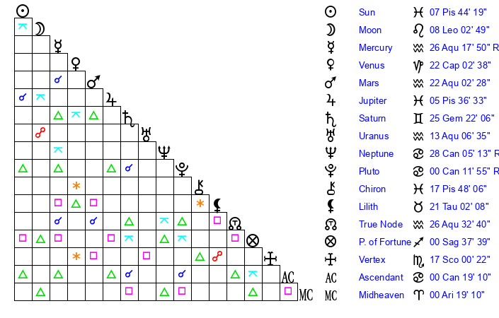 | Sun | 7 Pisces 44 | 9 Pisces 3 | 25 Gemini 7 |