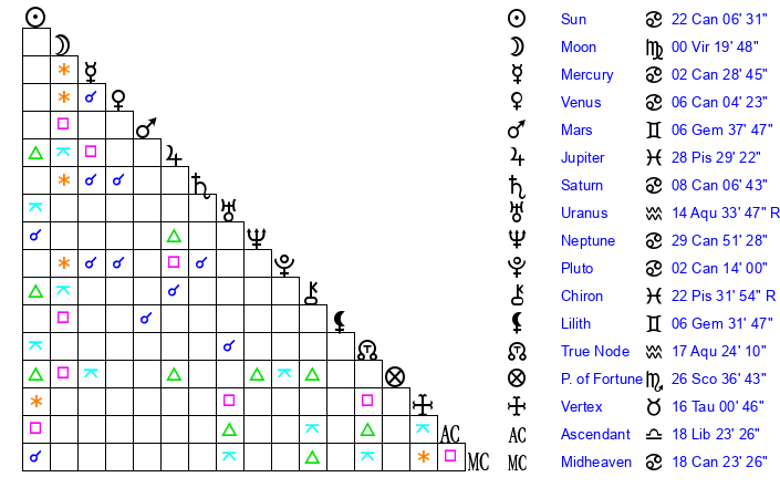 | Moon | 0 Virgo 27 | 23 Pisces 19 | 8 Virgo 20 |