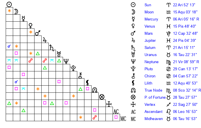 | Saturn | 21 Aries 22 | 25 Pisces 54 | 0 Taurus 17 |