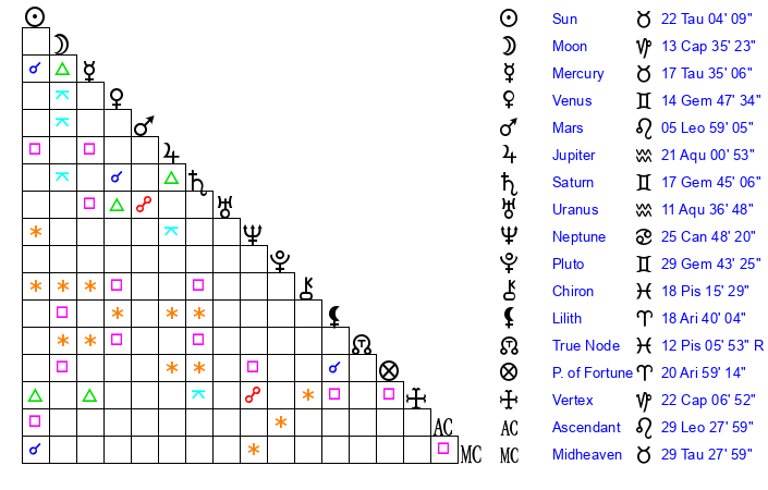 | Moon | 13 Capricorn 38 | 4 Sagittarius 13 | 4 Aquarius 44 |