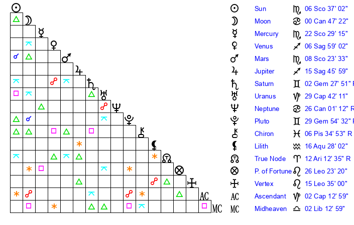 | Jupiter | 4 Sagittarius 24 | 13 Gemini 9 | 14 Sagittarius 22 |