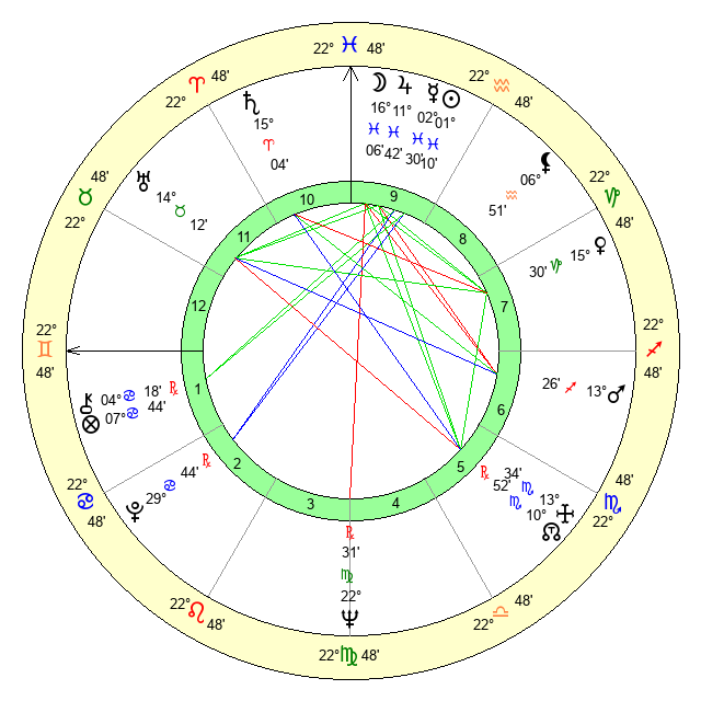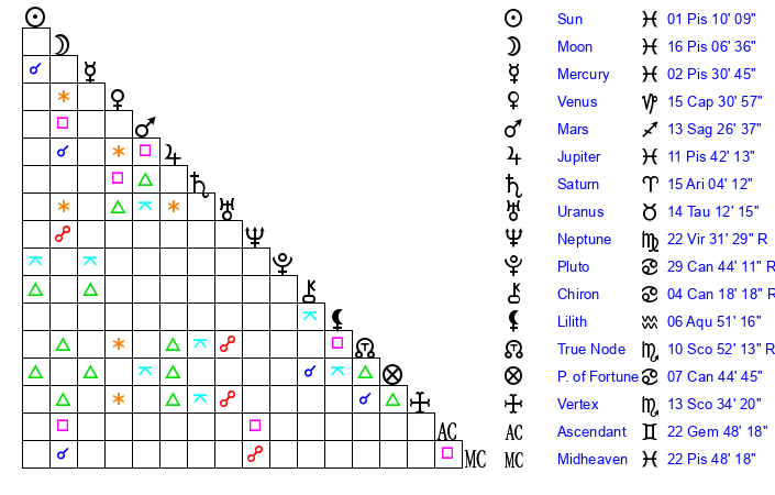 | Moon | 16 Pisces 10 | 1 Sagittarius 51 | 7 Taurus 26 |