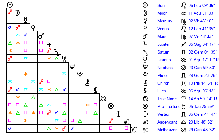 | Moon | 11 Aquarius 53 | 5 Libra 49 | 27 Pisces 21 |