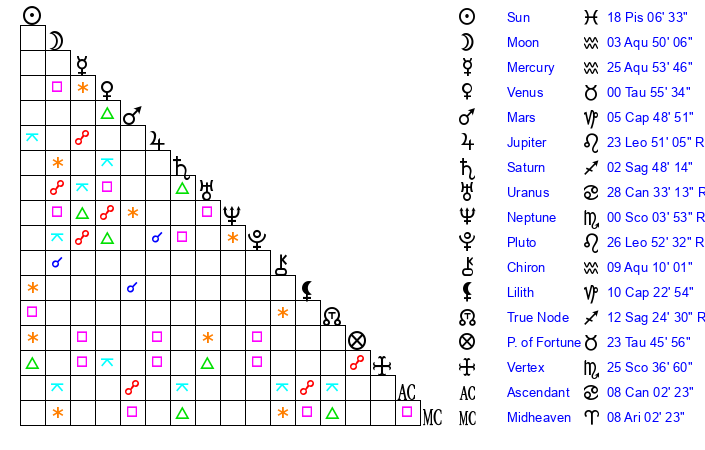 | Sun | 18 Pisces 6 | 18 Pisces 22 | 25 Taurus 46 |