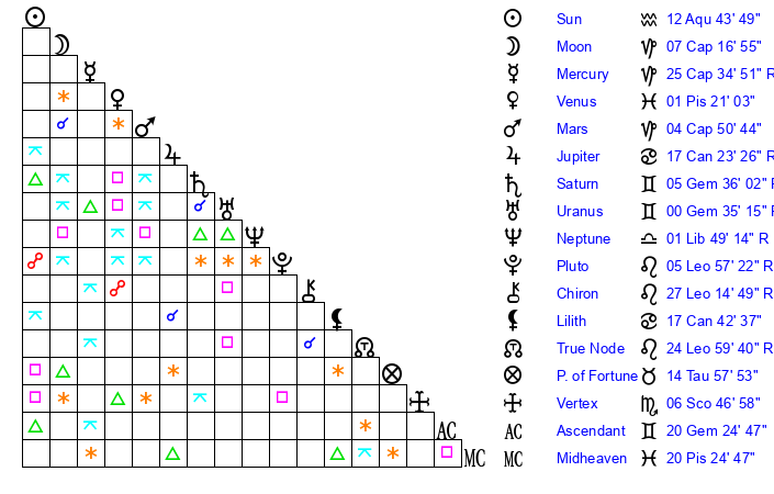 | Saturn | 5 Gemini 53 | 17 Pisces 31 | 10 Gemini 54 |