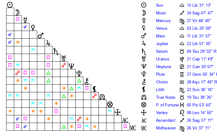 | Sun | 15 Libra 31 | 16 Libra 39 | 11 Aquarius 44 |