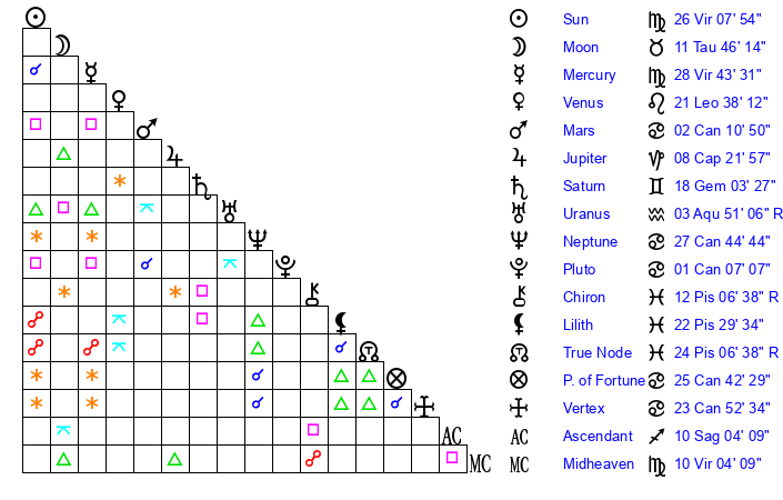 | Sun | 26 Virgo 8 | 27 Virgo 0 | 18 Capricorn 37 |