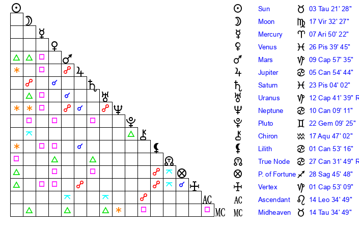 | Moon | 17 Virgo 28 | 21 Pisces 16 | 17 Capricorn 41 |