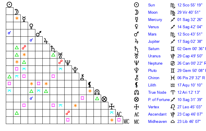 | Sun | 12 Scorpio 55 | 13 Scorpio 32 | 7 Pisces 31 |