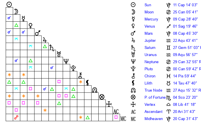 | Mercury | 9 Capricorn 29 | 1 Capricorn 16 | 23 Aries 31 |