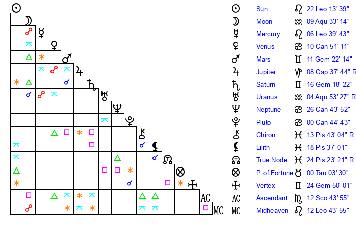 | Sun | 22 Leo 13 | 23 Leo 7 | 12 Sagittarius 59 |
