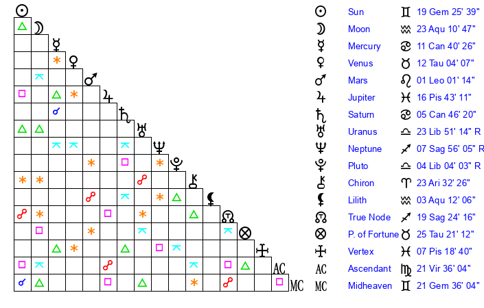 | Sun | 19 Gemini 25 | 20 Gemini 4 | 8 Leo 5 |