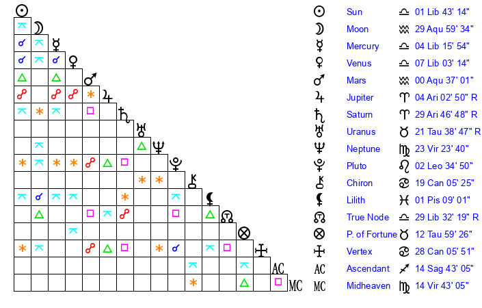 | Venus | 7 Libra 3 | 7 Virgo 34 | 24 Capricorn 17 |