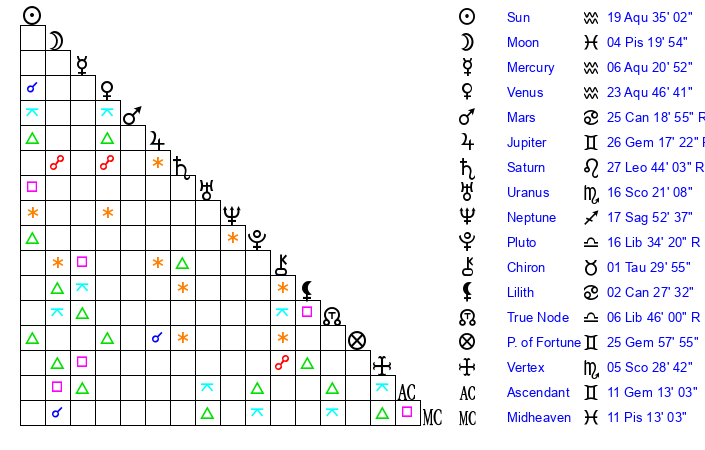 | Sun | 19 Aquarius 35 | 20 Aquarius 11 | 6 Aries 40 |