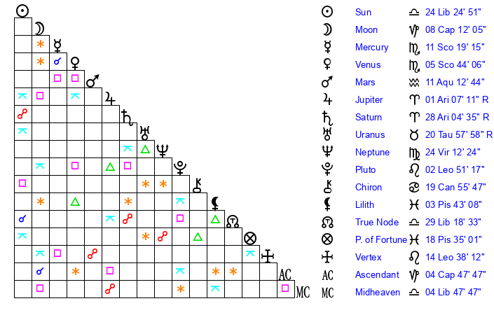 | Sun | 24 Libra 25 | 25 Libra 34 | 21 Capricorn 21 |