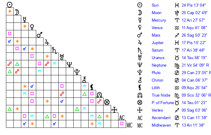 | Sun | 24 Pisces 13 | 25 Pisces 22 | 17 Gemini 57 |