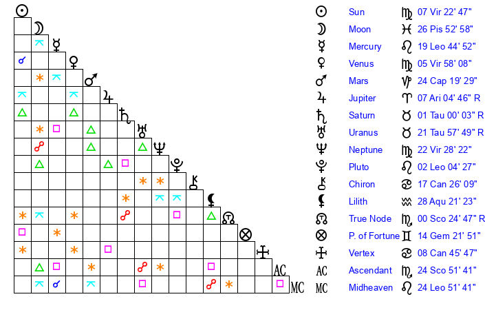 | Moon | 26 Pisces 58 | 13 Sagittarius 23 | 17 Taurus 55 |