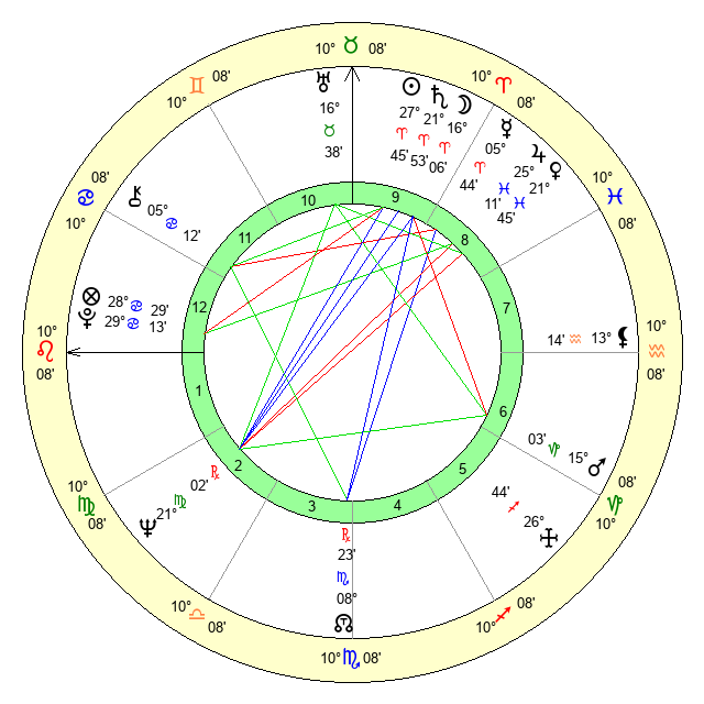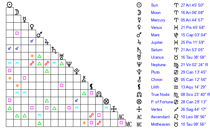 | Sun | 27 Aries 45 | 28 Aries 54 | 20 Cancer 23 |