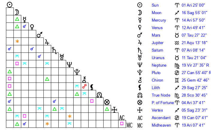 | Mercury | 14 Aries 58 | 6 Aries 13 | 19 Gemini 27 |