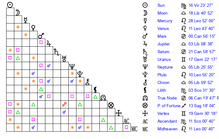Moon | 18 Libra 45 | 9 Aries 46 | 27 Virgo 21 |